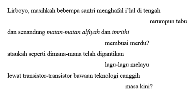 Tentang ini, saya teringat dan karenanya, saya ingin mengutip puisi karya K. H. Mustofa Bisri. Seorang ulama’-penyair, yang dulu juga merupakan alumnus pesantren yang pernah menjadi tempat saya nyantri itu, pernah menulis sebuah puisi berjudul “Lirboyo, Kaifa Haal?”